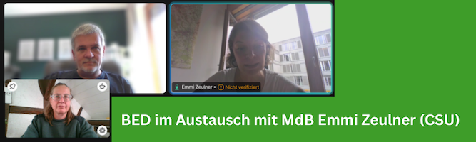 Am 17.9.25 trafen sich für den BED Christine Donner und Volker Brünger zu einem erneuten Austausch mit MdB Emmi Zeulner (CSU) per Videokonferenz.