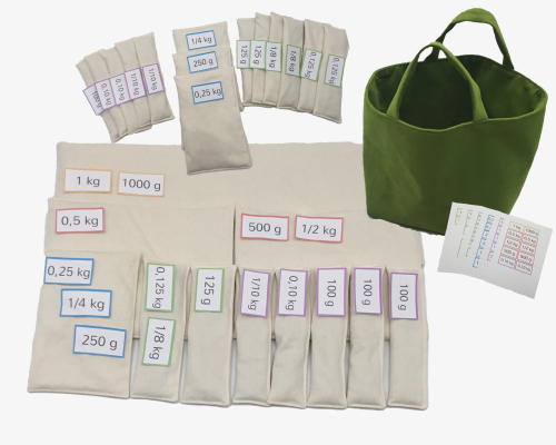 - Gewichtsmaße-Kissen: Kissen, die Gewichte und Masse erlebbar machen. Jede Einheit repräsentiert exakt das entsprechende Gewicht. Das modulare System ermöglicht Kombinationen, die immer 1 kg ergeben, um das Zusammenspiel der Gewichte visuell und haptisch begreifen zu lernen.