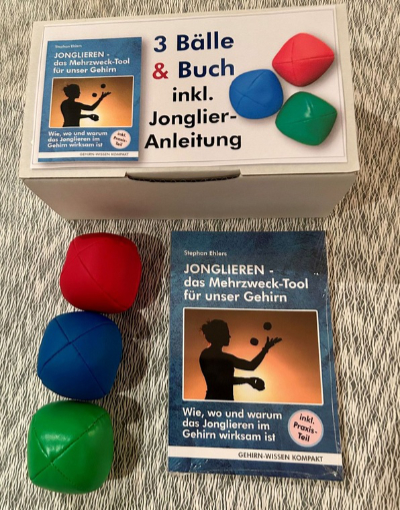 Das Set enthält drei professionelle Jonglierbälle (51 mm/90 g je Ball) – perfekt für Einsteiger*innen – sowie das Buch „JONGLIEREN – das Mehrzweck-Tool für unser Gehirn“ inkl. einer klar strukturierten Anleitung, mit der innerhalb kürzester Zeit das Jonglieren mit drei Bällen möglich wird.